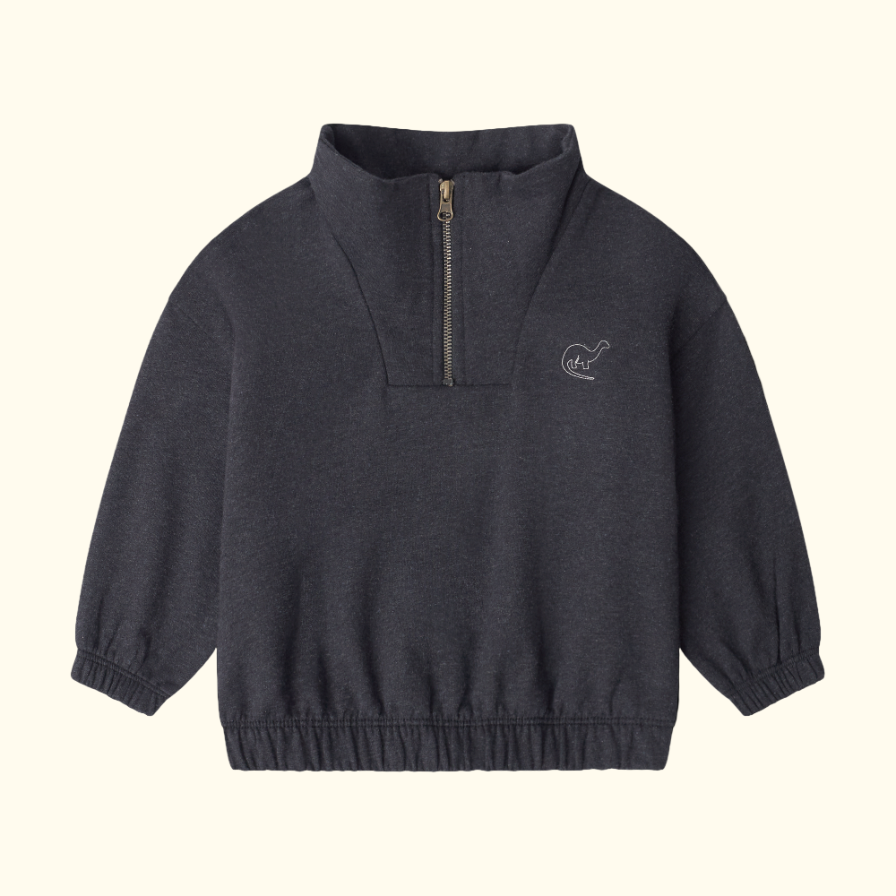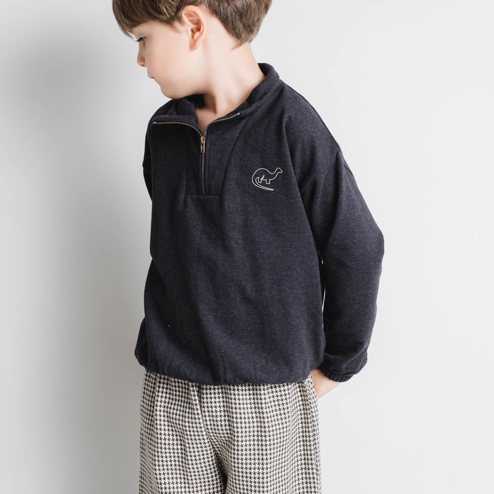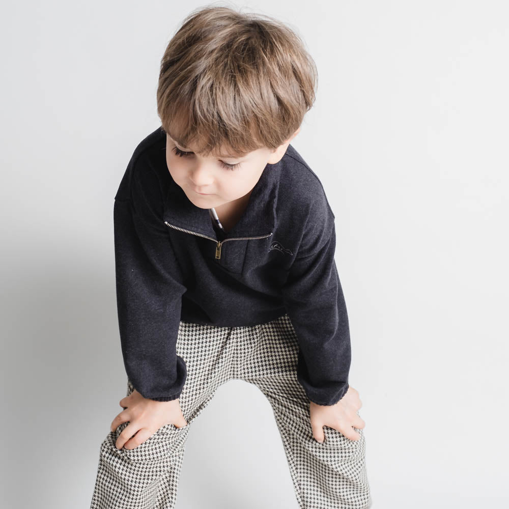 Bluza Julius vjen me vija ngjyrë gri të errët për të vegjlit tuaj. E përbërë nga pambuku organik dhe elastani, ofron butësi, stil dhe ngrohtësi maksimale për lëkurën.
