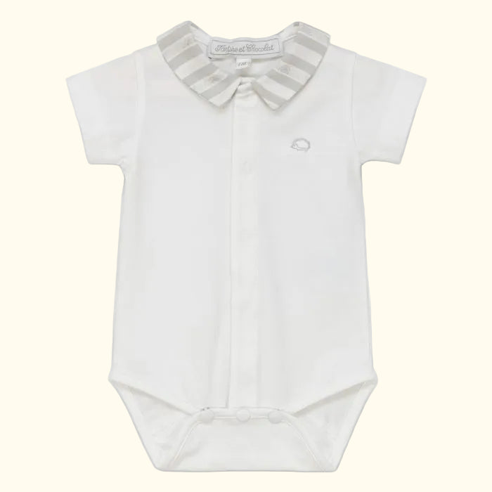 Pershkrimi : Bluzë Tartine et Chocolat për djem, në ngjyrë blanc (te bardhe) me detajin e jakes te dizenjuar, pjesë e koleksionit trousseau, e punuar me material të butë dhe cilësor që respekton lëkurën delikate të fëmijëve. Dizajn elegant dhe i rehatshëm, ideal për përdorim të përditshëm ose për kombinime të veçanta me stil klasik.