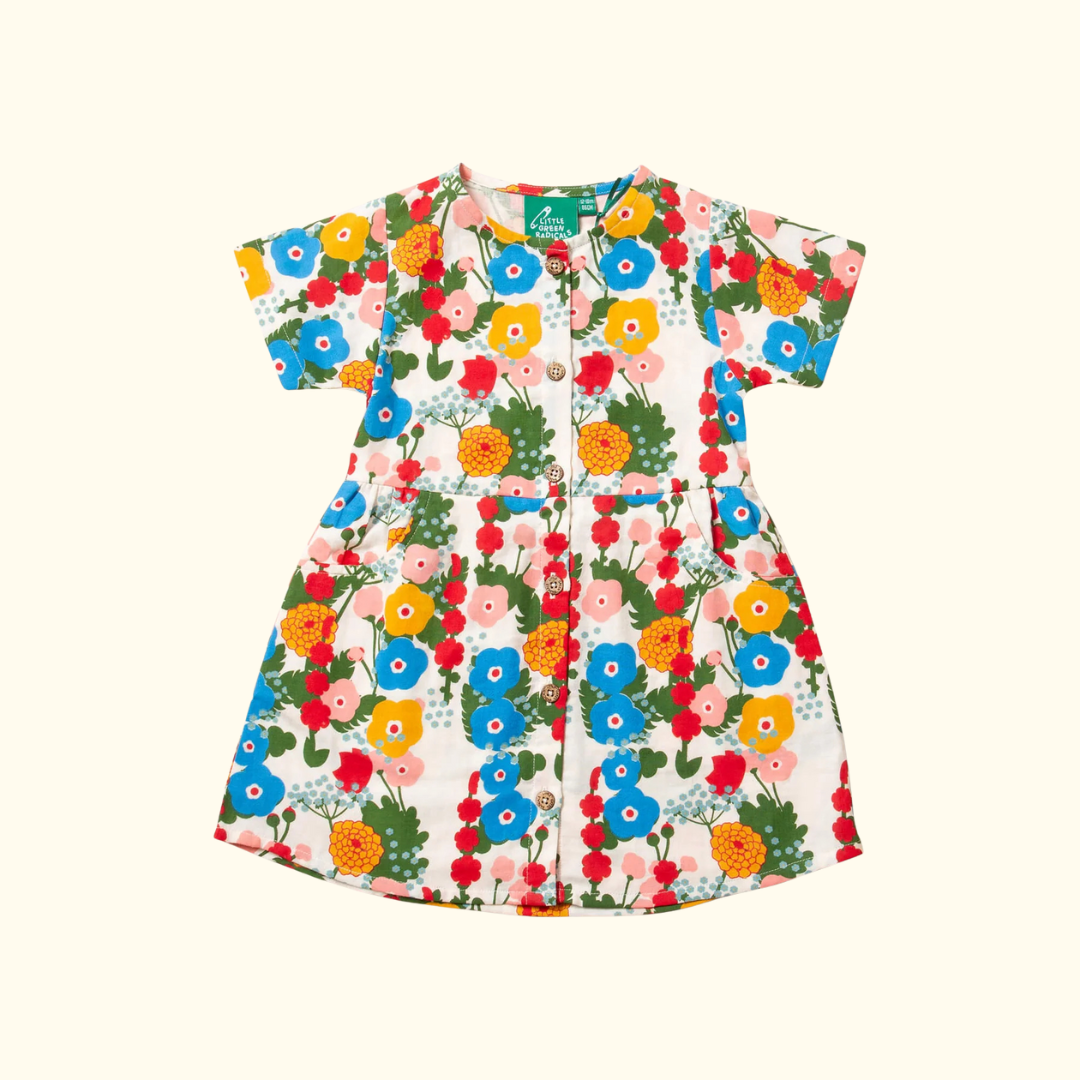 Fustan me Kopsa dhe Mëngë të Shkurtra l Me dizajn lulesh dhe materiala 100% Pambuk Organik 🌿