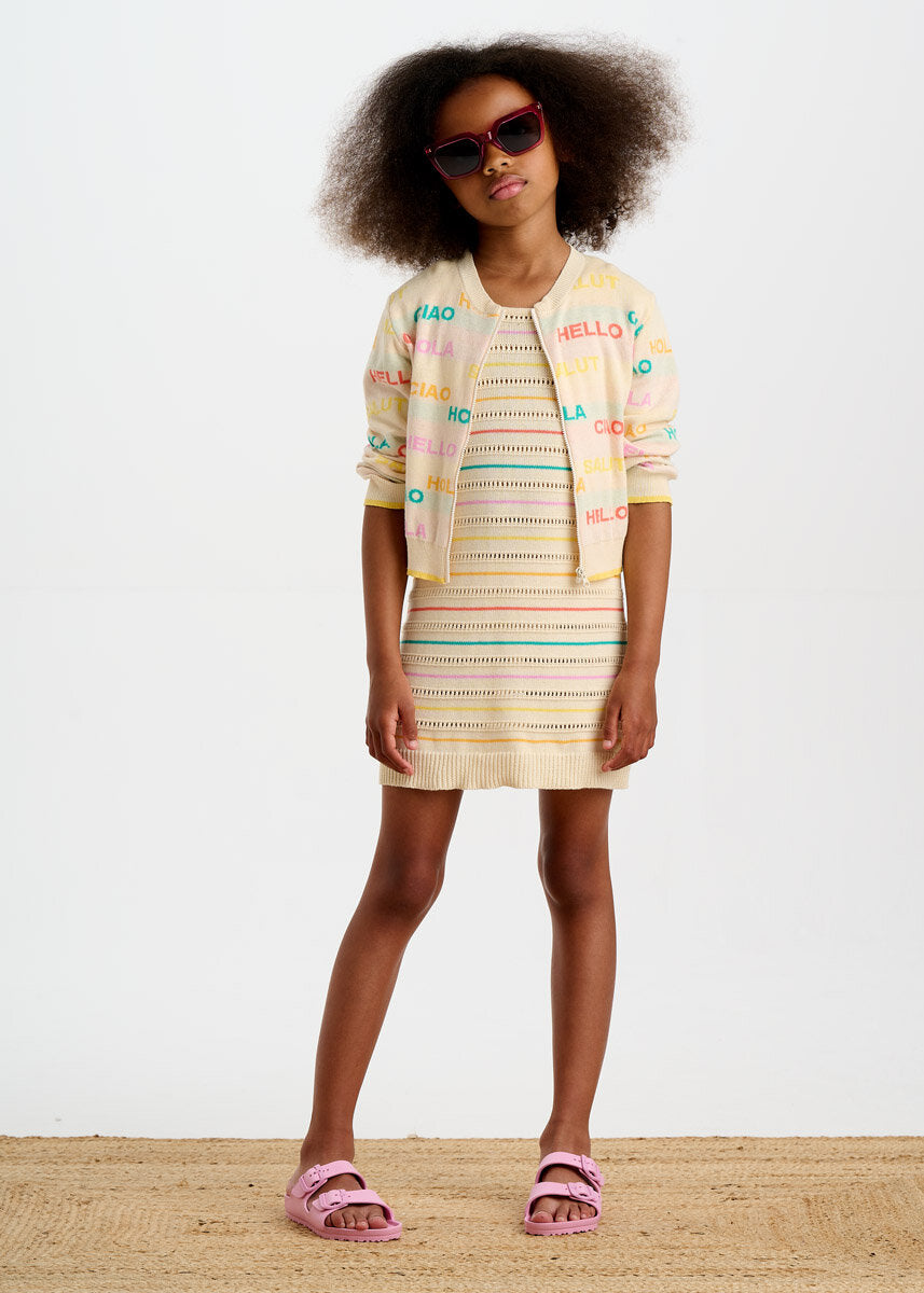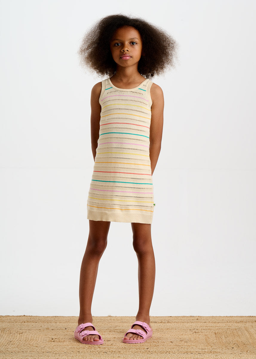 Fustani CAPRI sjell freski dhe prakticitet për ditët me diell. I punuar me kujdes nga pambuku organik me teksturë pointelle, ky fustan është perfekt per stinën e verës. Me dizajn të frymëzuar nga natyra, është zgjedhja ideale për lojëra apo festa.