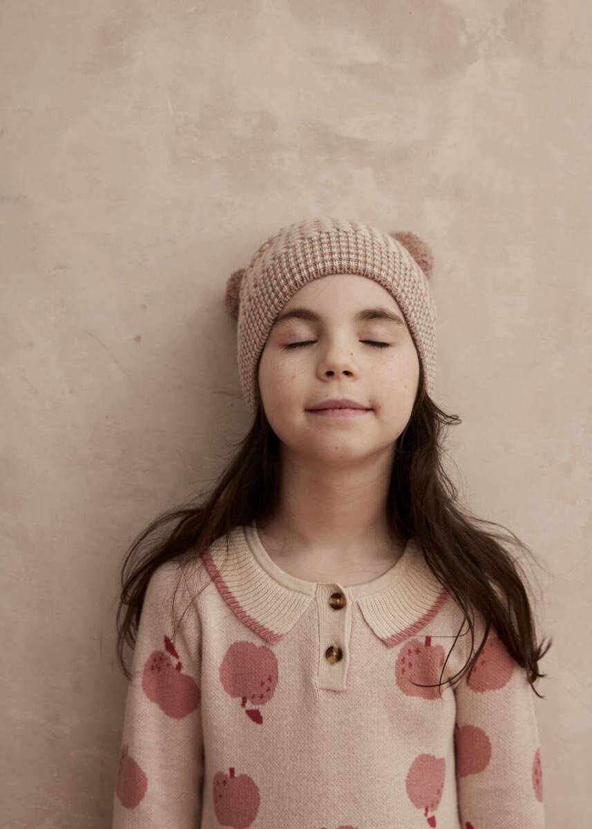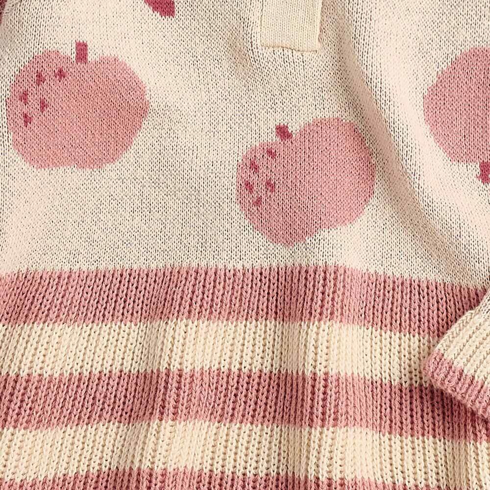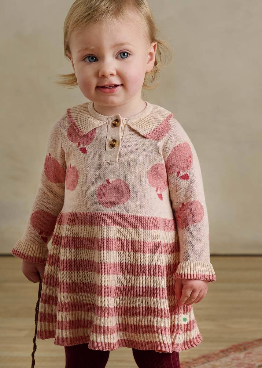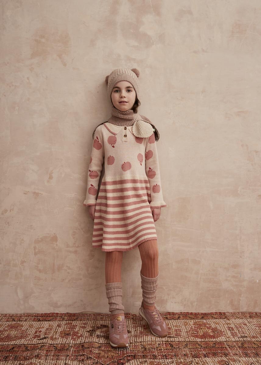 Fustan i butë me fruta në fund, i zbukuruar me dizajn molle. I ngrohtë dhe i rehatshëm për ditët e ftohta.