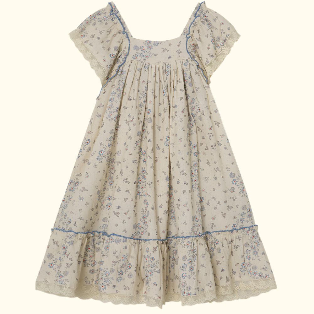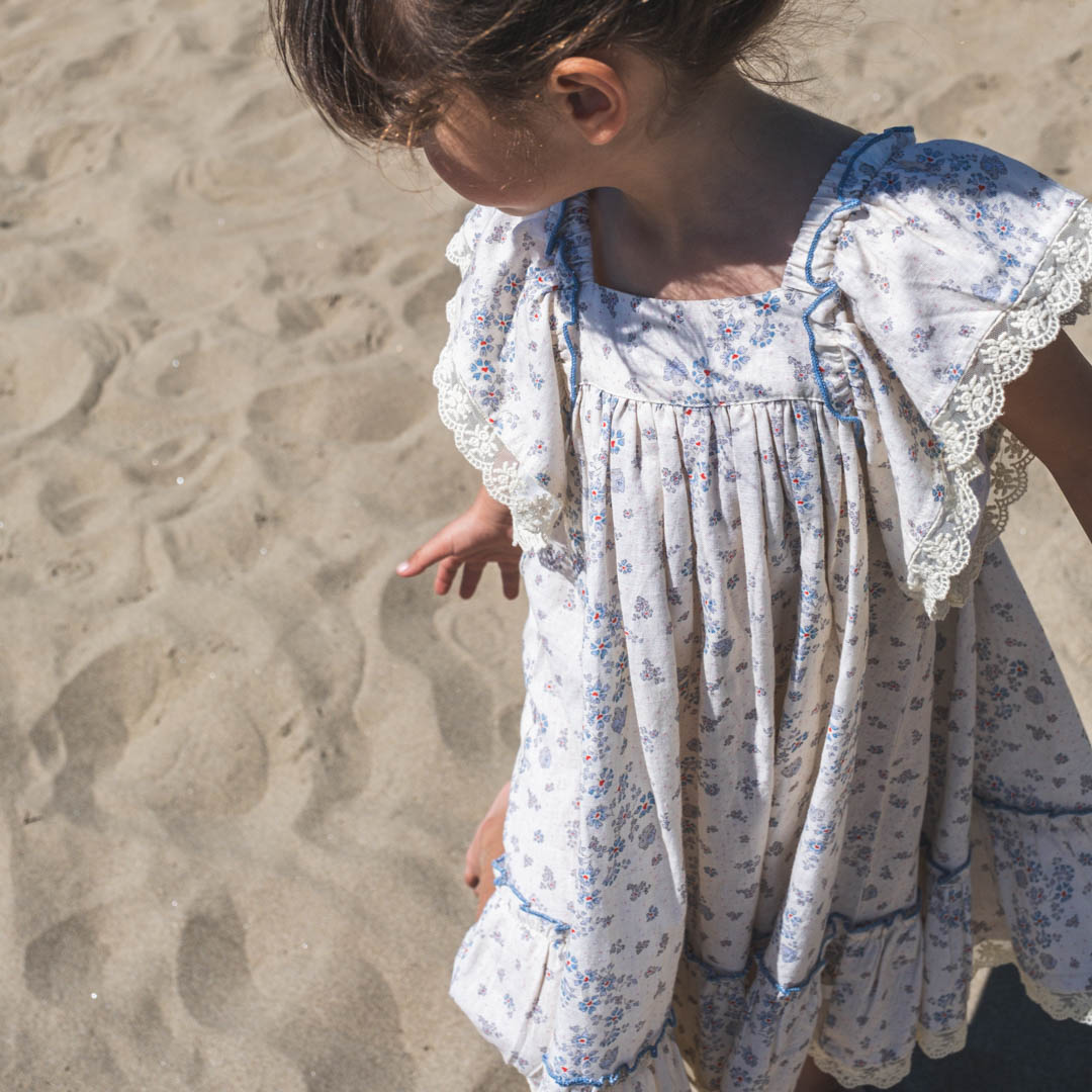 Fustan i lehtë dhe i ajrosshëm për vajza, me print lulesh shumëngjyrëshe dhe volange në mëngë, perfekt për ditët e ngrohta të verës. I bërë nga pambuk dhe lino për rehati maksimale dhe lëvizje të lirë.