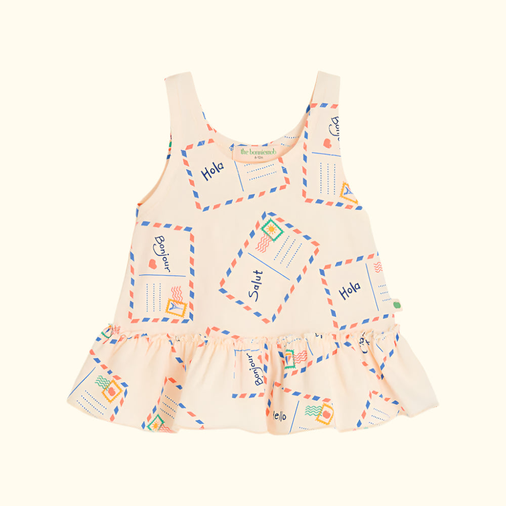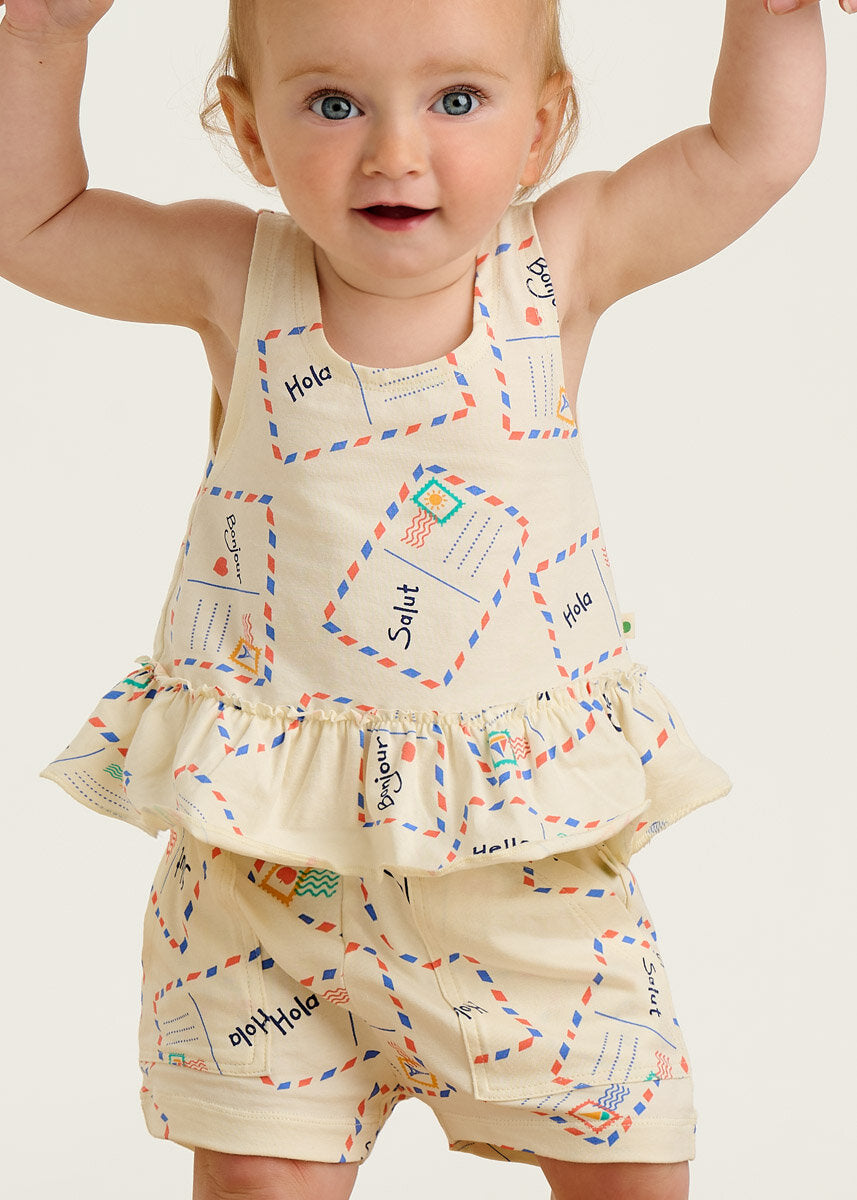 SCOOPS është një kanatjere verore e lehtë dhe e gëzueshme, me formë të lirshme dhe detajin e ëmbël me fruta. Printi “Postcard” sjell kujtime pushimesh dhe udhëtimesh të para, ndërsa materiali i butë me përbërje organike e bën këtë bluzë ideale për ditët me diell. Kombinohet në mënyrë perfekte me pantallona të shkurtra, tuta apo funde verore.