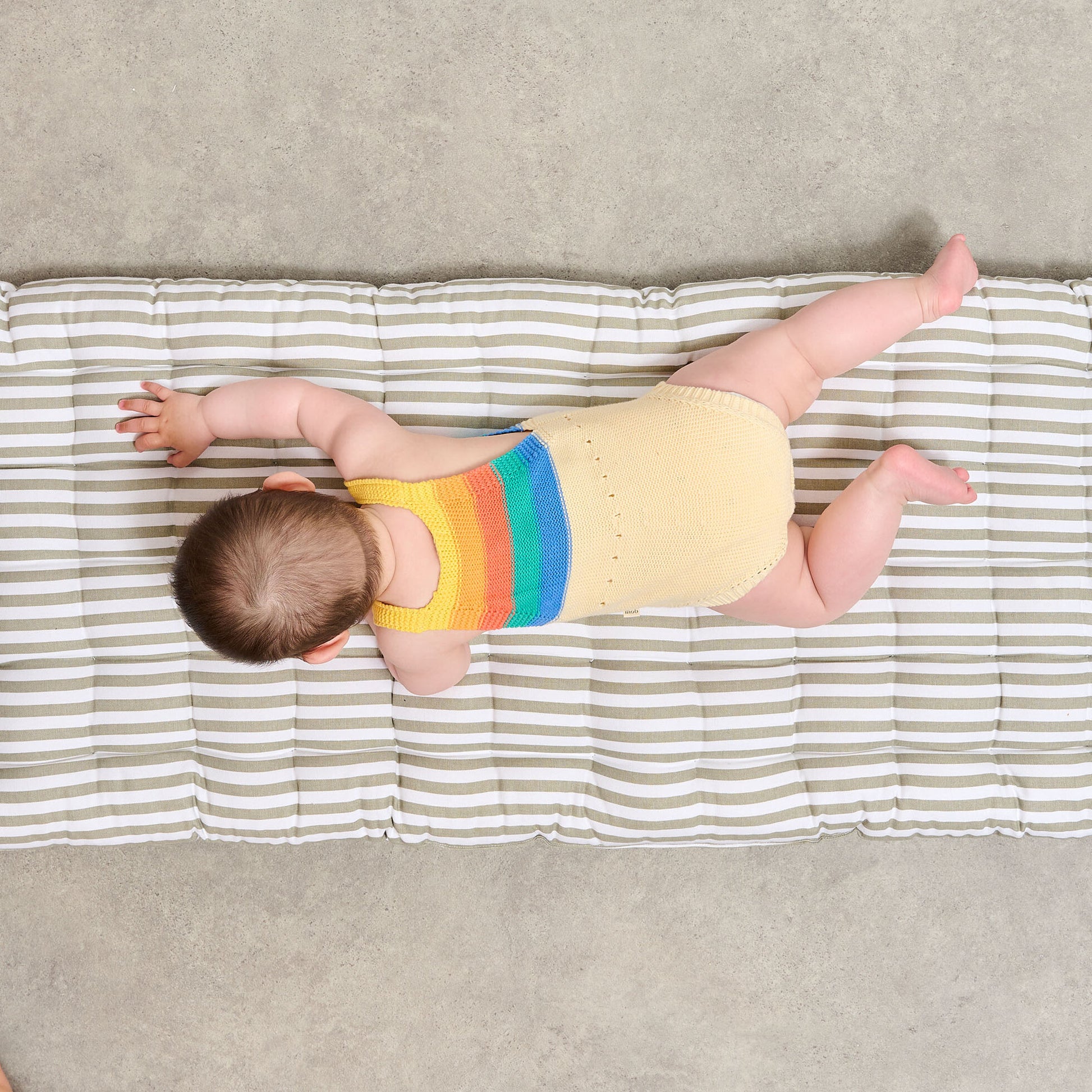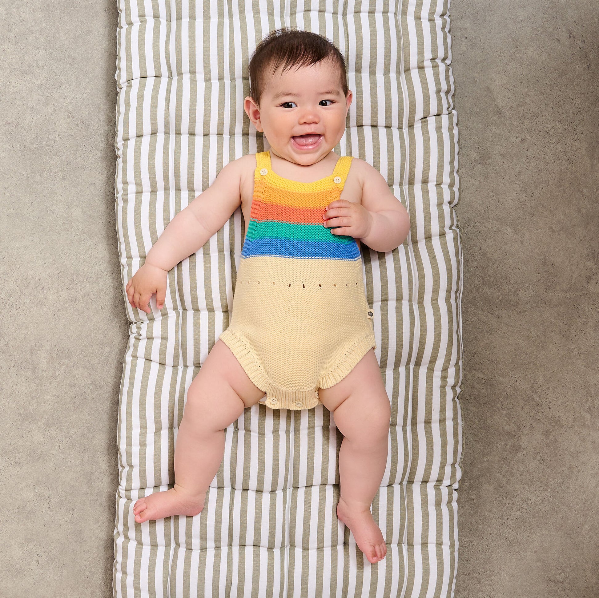 Të dizajnuara për lëkurën e ndjeshme të foshnjës, janë të punuara me pambuk të pastër organik, që i bën të buta, të freskëta dhe praktike. Dizajni me shirita ylberi sjell ngjyra dhe gëzim në çdo hap të parë.