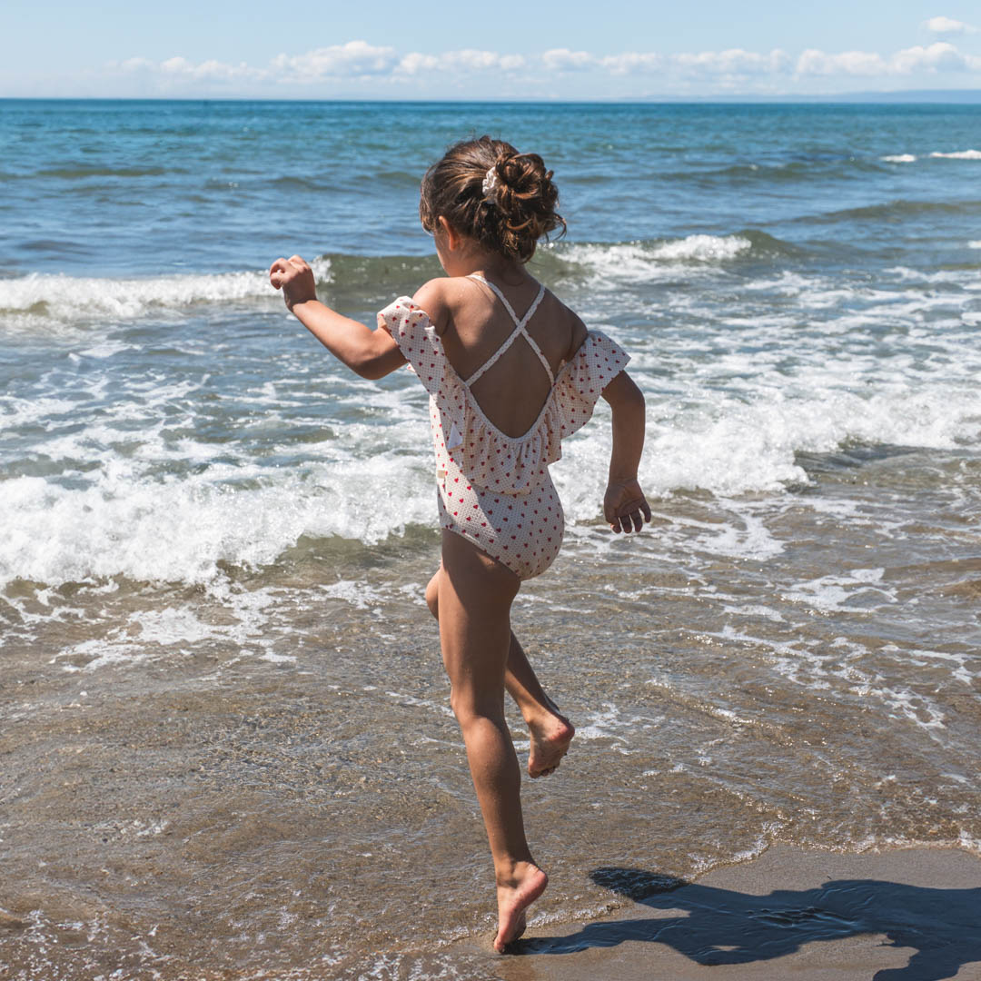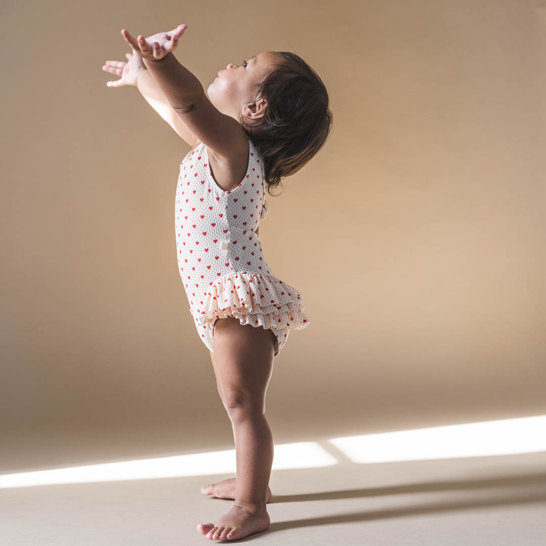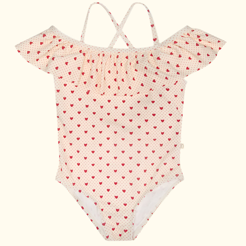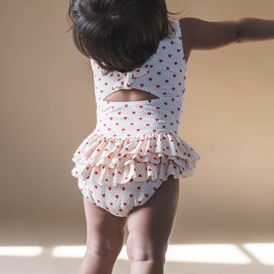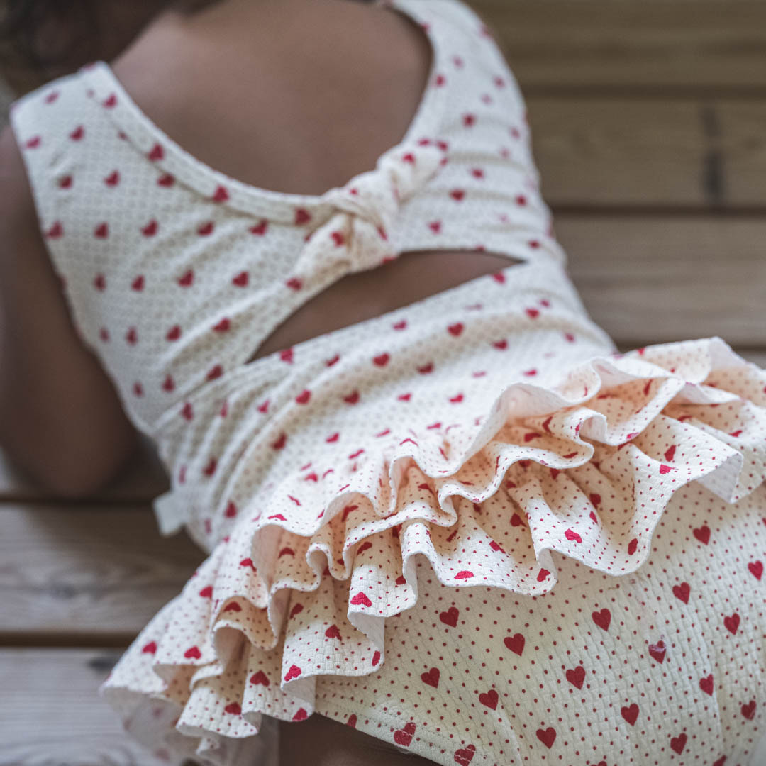 Një tjetër model kostumi banje me zemra të kuqe, që shton stil dhe gëzim në çdo ditë verore në plazh.