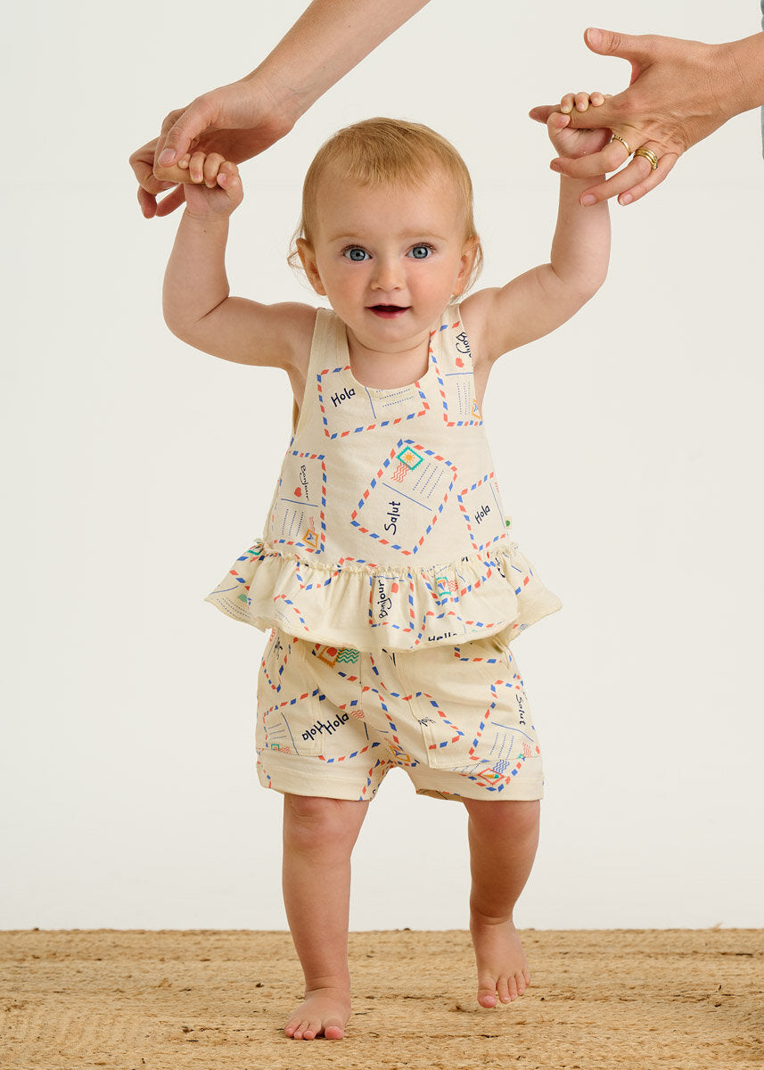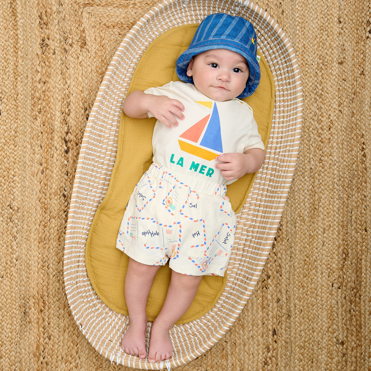 Pantallonat e shkurtra SAILOR janë krijuar për ditë në lëvizje, lojëra dhe aventura. Me material të butë jersey dhe përbërje organike, ato janë zgjedhja perfekte për shëtitje verore, udhëtime apo thjesht për t’u ndjerë rehat në çdo moment. Printi “Postcard” sjell një ndjesi udhëtimi dhe fëmijërie të gëzueshme, duke i kthyer këto pantallona në një pjesë të dashur të garderobës verore.