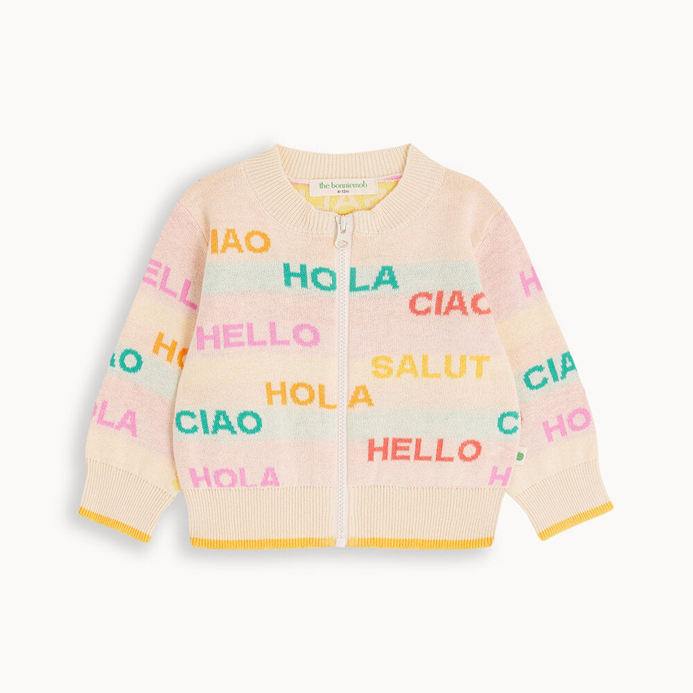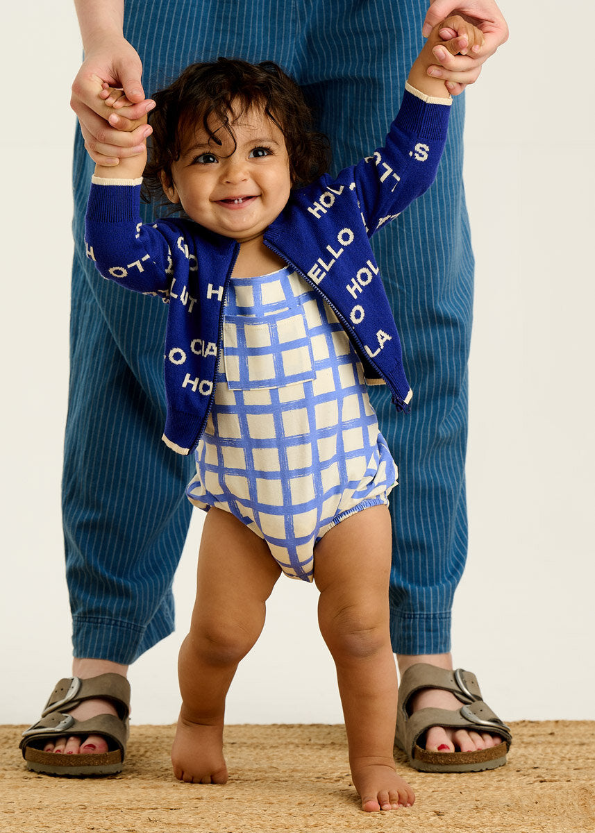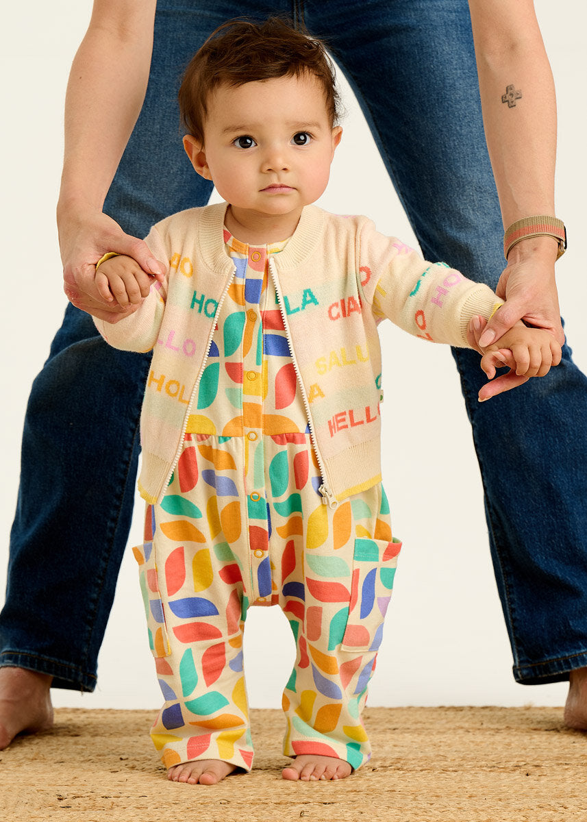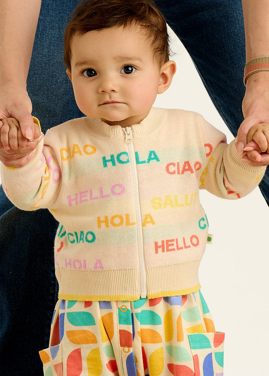 Pulovra PORTOFINO është një shtresë e lehtë, e domosdoshme për mëngjeset e freskëta dhe netët e gjata të verës. Me dy variante të ngjyrave, Rainbow shumëngjyrësh dhe kombinimin klasik Navy Cream, ky kardigan i sjell veshjes një prekje stili dhe argëtimi në të njëjtën kohë. I punuar nga pambuku organik, është i butë për lëkurën e ndjeshme dhe mjaftueshëm i hollë për t’u veshur mbi çdo body apo kominoshe të koleksionit tonë.